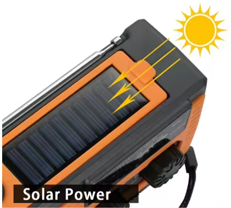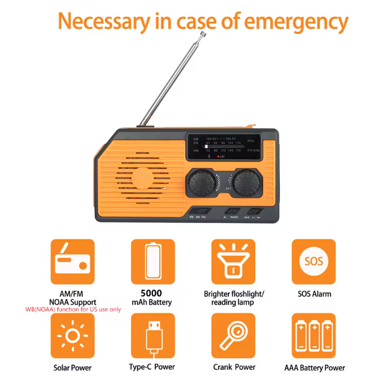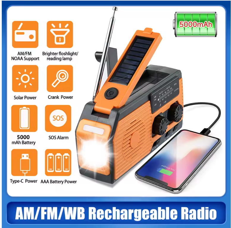 You can charge the radio with a USB-C cable. In emergencies or power outages, use the hand crank, solar panel, or AAA batteries (not included). The built-in 5000mAh battery powers the radio, light, or can charge devices like phones or GPS.